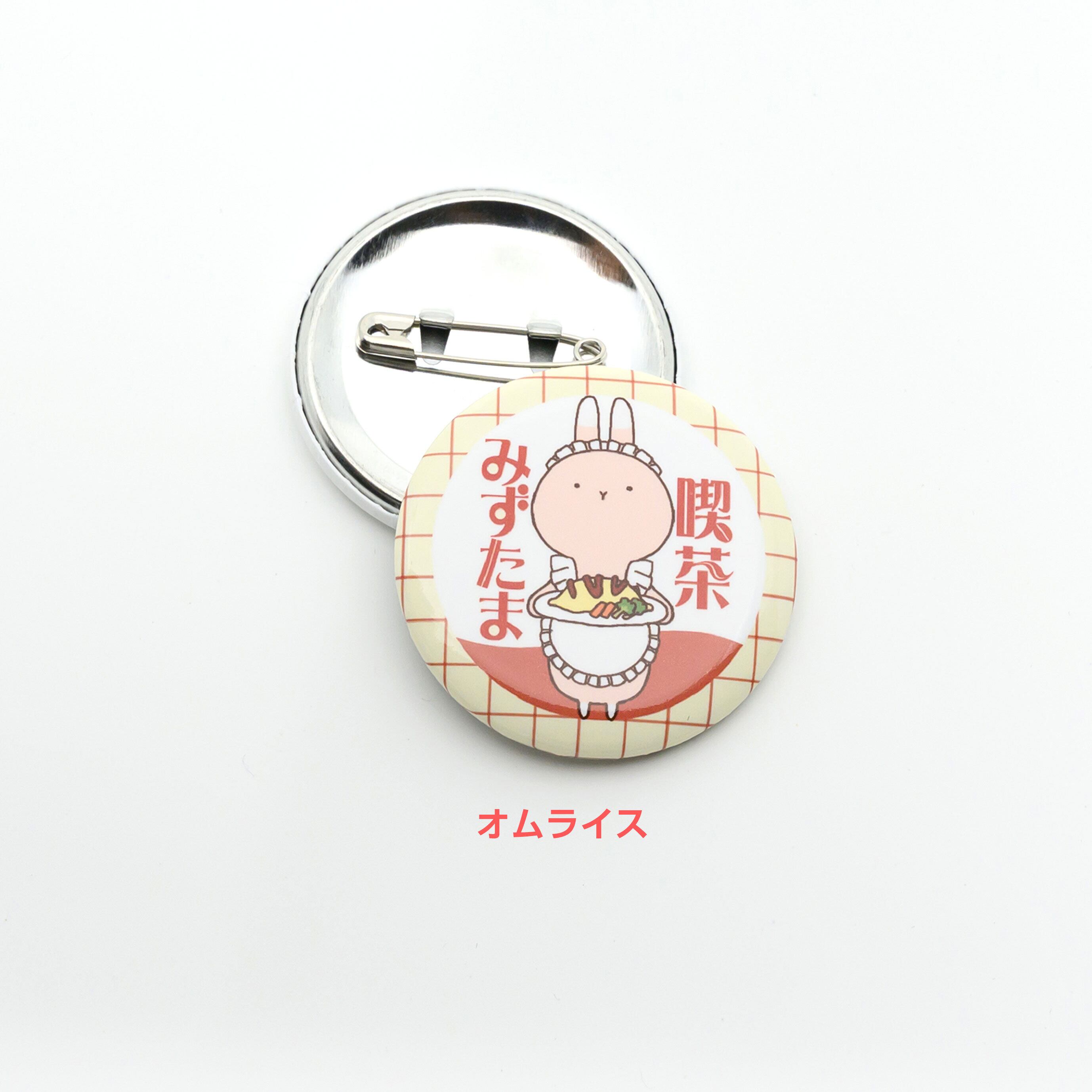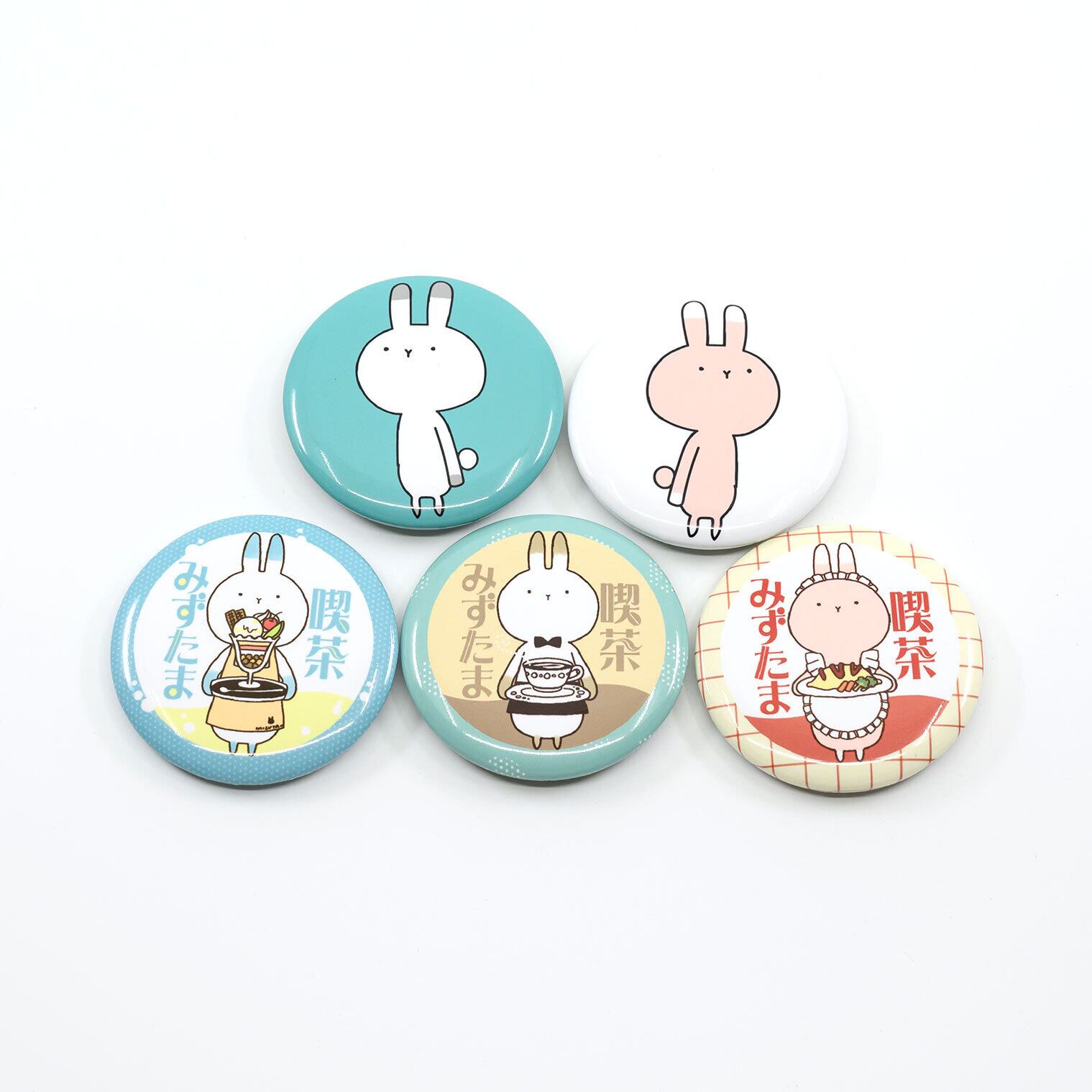 喫茶店うさもちの3種とシンプルなうさもち2種の缶バッジです。